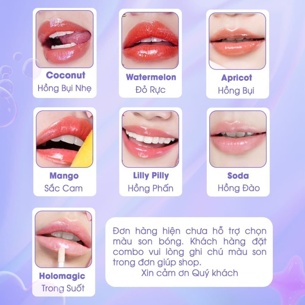 🍭 Holomagic: Trong suốt lấp lánh với ánh nhũ nhẹ, giúp đôi môi trông bóng bẩy hơn, dễ dàng kết hợp với mọi phong cách và màu son khác.